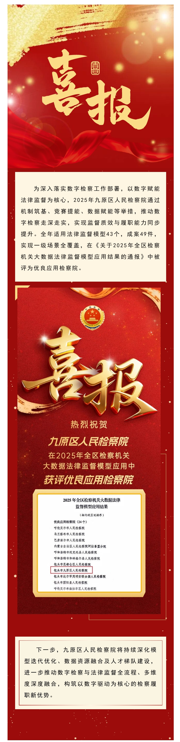 喜报!九原区人民检察院在2025年全区检察机关大数据法律监督模型应用中获评优良应用检察院