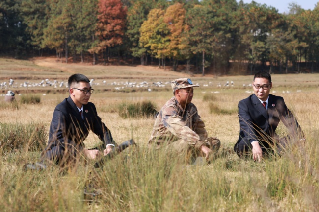 2023年9月,贵州省威宁县检察院检察官李爱(右一)和同事在贵州草海国家级自然保护区走访调查黑颈鹤栖息地保护情况。