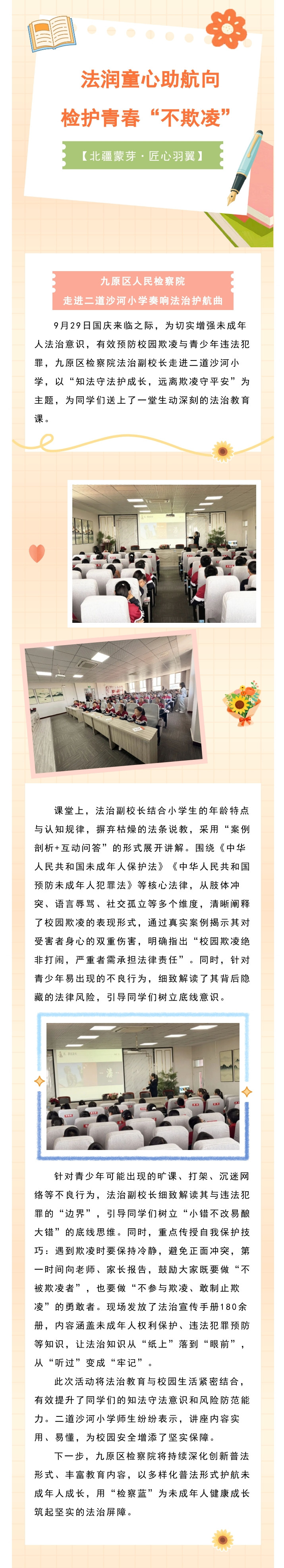 【北疆蒙芽·匠心羽翼】 法润童心助航向 检护青春“不欺凌”——九原区人民检察院走进二道沙河小学奏响法治护航曲