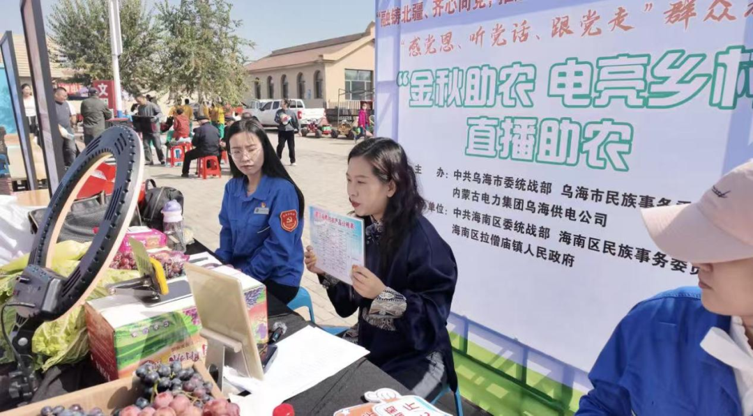 9月23日,乌海市海南区拉僧庙镇赛汗乌素村黄河西行客栈广场举办民族团结进步系列活动,并组织开展“金秋助农”活动,通过直播带货方式帮助各族群众销售特色农副产品。(图片来源:乌海市民委提供)