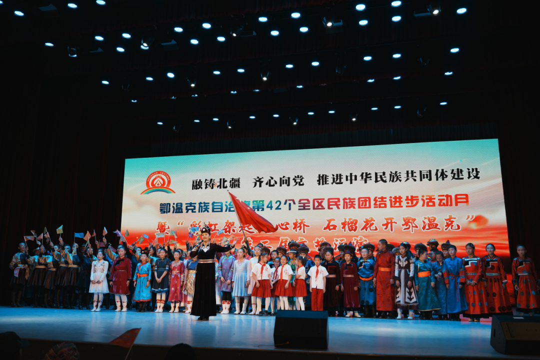 呼伦贝尔市鄂温克族自治旗举办第42个全区民族团结进步活动月暨“彩虹架起连心桥 石榴花开鄂温克”文艺汇演。(图片来源:呼伦贝尔市民委提供)