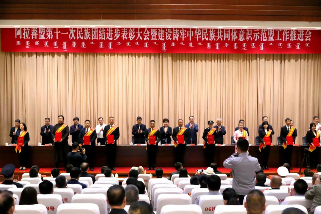 9月19日,阿拉善盟召开第十一次民族团结进步表彰大会暨建设铸牢中华民族共同体意识示范盟工作推进会。(图片来源:阿拉善盟民委提供)