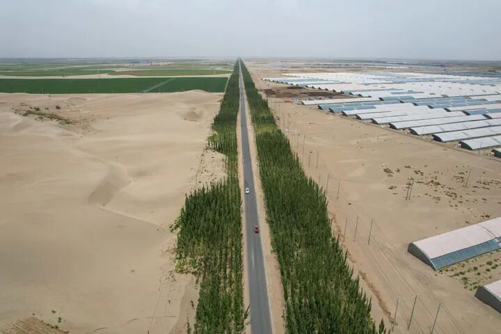▲ 2024年6月15日,在新疆和田地区和田县的防护林带,道路两边是沙漠饲草基地和设施农业基地(无人机照片)。新华社记者 丁磊 摄
