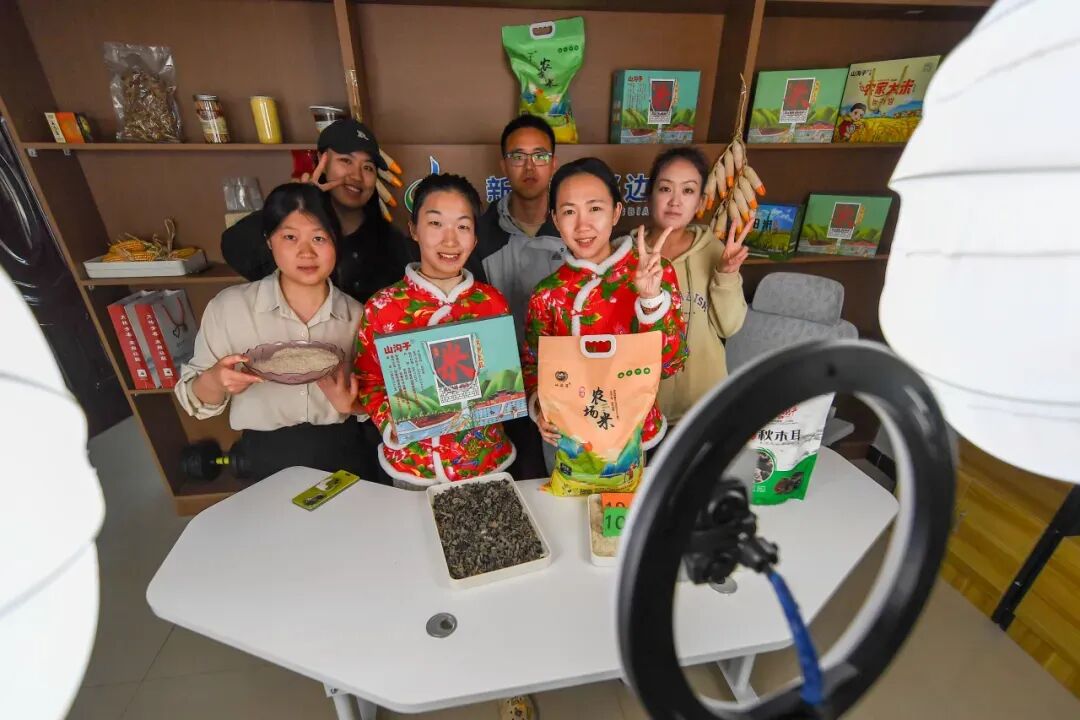 ▲ 在吉林省延边朝鲜族自治州珲春市杨泡满族乡的东阿拉村,网络主播向直播间的观众介绍着手中的大米。新华社记者 张楠 摄