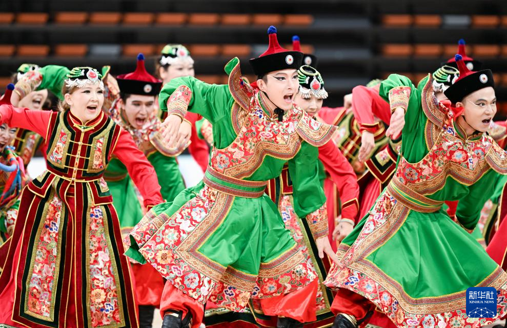 ▲2024年11月28日,第十二届全国少数民族传统体育运动会表演项目(室内)在海南省三亚市体育中心体育馆举行。这是江苏队选手表演《我们一起来博克》。 新华社记者 徐速绘 摄