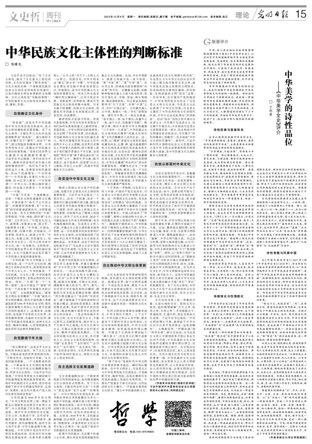 中华民族有5000多年的文明史,“中华文明是世界上唯一绵延不断且以国家形态发展至今的伟大文明”,为人类贡献了叹为观止的文明成果。展开中华文明的历史长卷,王官之学、先秦诸子学、汉代经学、魏晋玄学、隋唐佛学、宋明理学、清代考据学、现代新儒家等,始终守其元而开生面,中华文脉连绵不绝、高峰迭起。中华文明不是自内向外扩张而发展起来的,而是自外向内凝聚而发展起来的,炎黄华夏为凝聚核心、“五方之民”共天下,文明之元一以贯之。回望历史,中华文明有过“蒙尘”却从未“中断”,中华民族在长期生活实践中积淀的思想认识、价值观念,成为中华民族文化主体性的重要支柱。冯友兰毕生追求“阐旧邦以辅新命”,江河万里总有源。老根新芽,旧邦新命,都是中华民族文化主体性的集中体现。历史文脉不容割断,巩固文化主体性,前提是对本民族文化的高度认同、由衷信仰、自觉赓续。