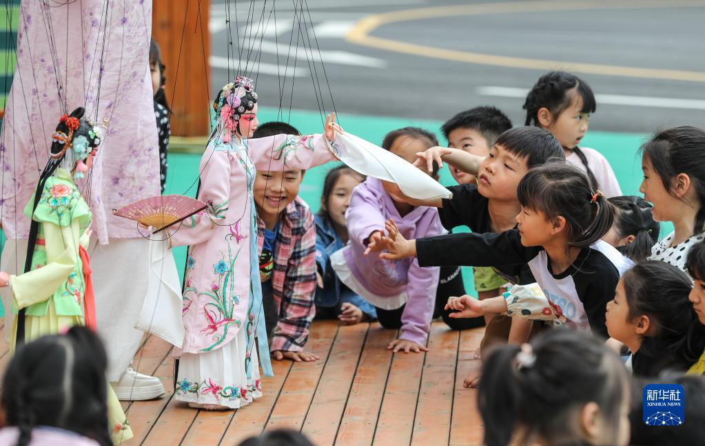 ▲江苏省苏州市吴江区积极推进非遗进校园活动。这是小朋友们近距离欣赏提线木偶。 新华社发