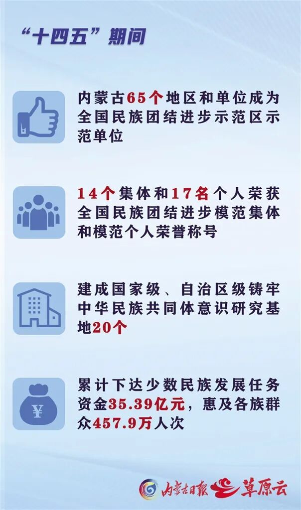 “十四五”期间,内蒙古累计下达少数民族发展任务资金35.39亿元,实施项目3640个,惠及各族群众457.9万人次;累计向20个边境旗(市、区)安排转移支付216.74亿元,加快完善“水电路讯”等基础设施,边境地区人均可支配收入年均增长6%以上;大力支持民贸民品企业发展,带动就业35.48万人……一组组扎实的数据,是各族群众生活水平不断提高、团结携手乐业兴边的生动注脚。